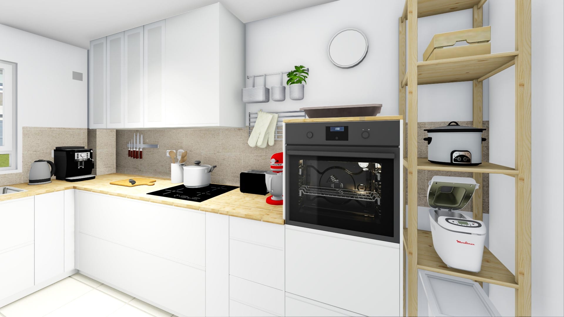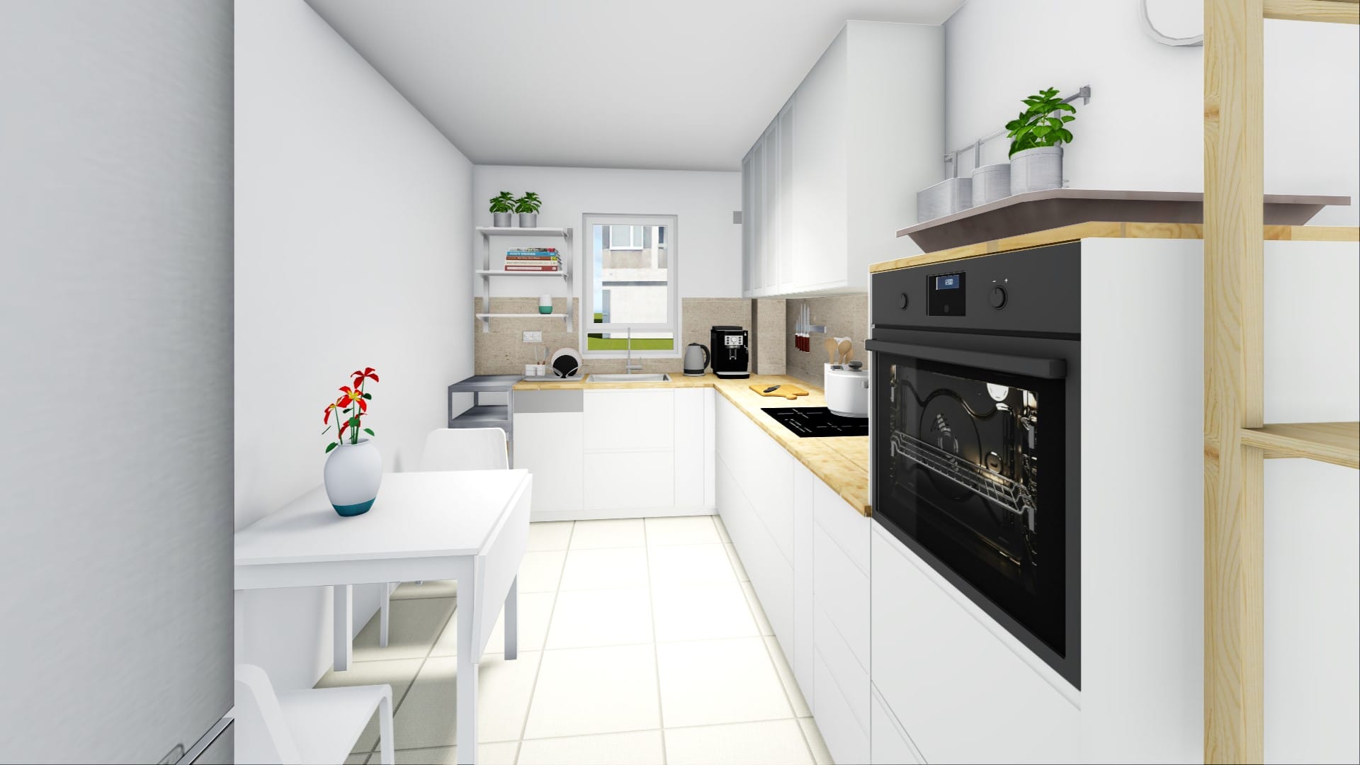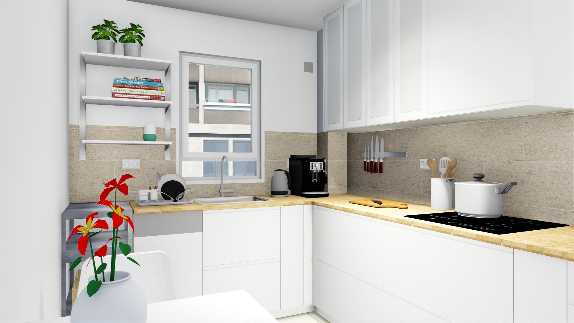O bucătărie albă, luminoasă, cu linii simple și un flux ergonomic clar, adaptată nevoilor lui B. și termenului scurt de implementare. Dincolo de aspectul curat, spațiul e gândit să funcționeze pe termen lung: loc pentru gătit, depozitare vizibilă și bine structurată, colț rezolvat corect și iluminat care pune în valoare zona de lucru.