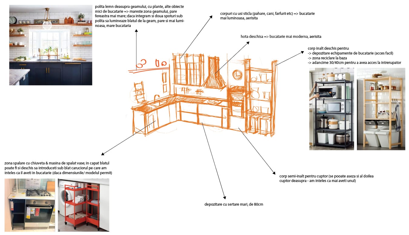 După ce B. a completat chestionarul meu de bucătărie — formularul despre care am povestit mai pe larg în articolul Modul meu de lucru — am schițat de mână o primă variantă, cu câteva idei-cheie: